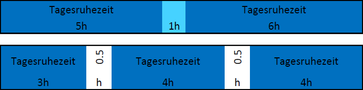 وبالإضافة إلى ذلك، ينظم قانون ساعات العمل فترات الراحة خلال ساعات العمل اليومية. الاستراحة مطلوبة بعد ست ساعات من العمل على أبعد تقدير. إذا كان وقت العمل من ست إلى تسع ساعات، فإن استراحة لمدة 30 دقيقة تكون كافية. بالنسبة لساعات العمل الأطول التي تصل إلى 10 ساعات كحد أقصى، يجب التخطيط لاستراحة مدتها 45 دقيقة بعد ست ساعات.